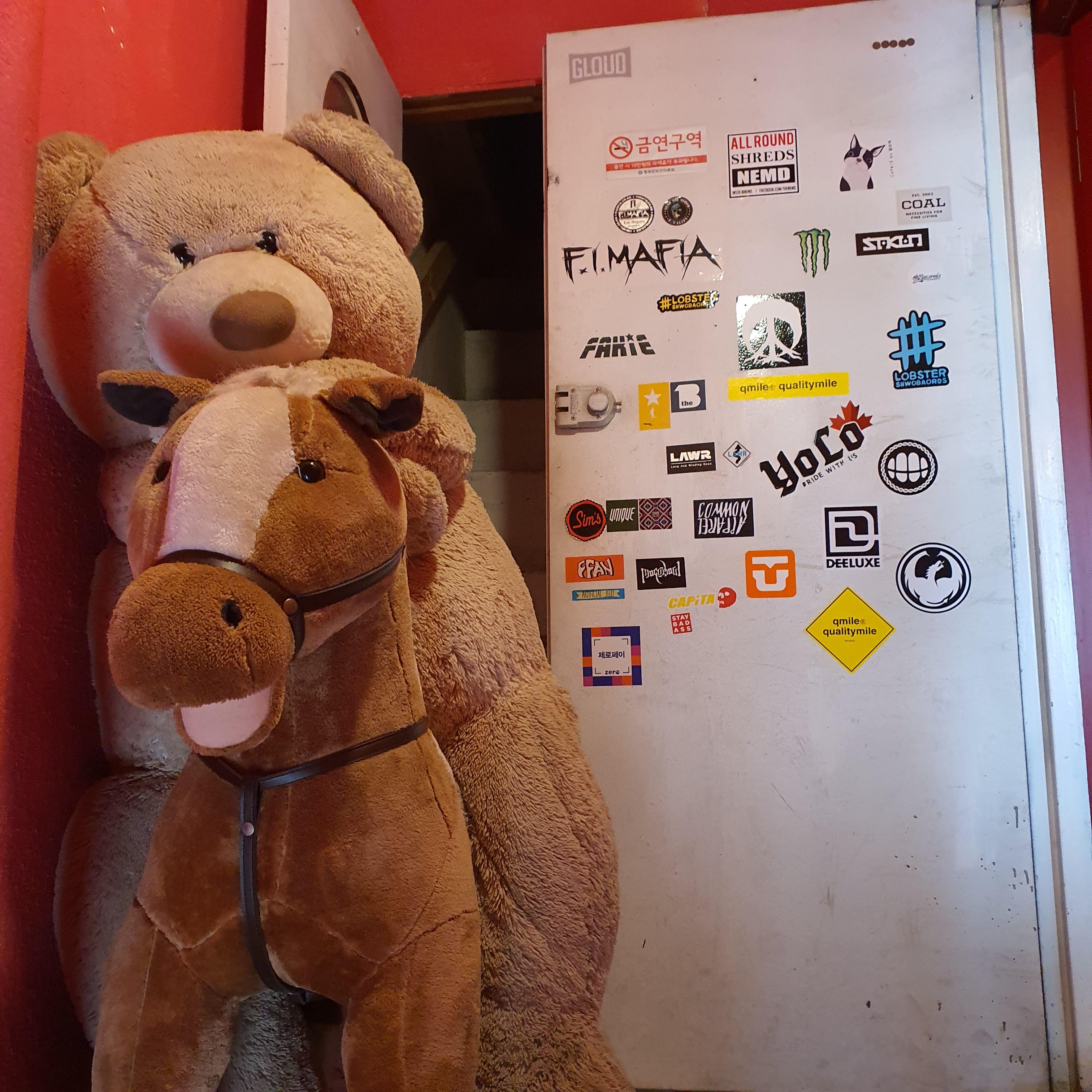 입구에 곰돌이 인형이 당나귀 인형과함께